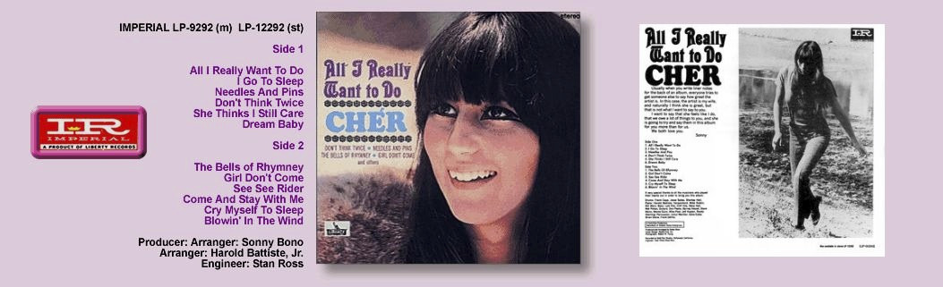 MONO LP STEREO LP CD All I Really Want To Do 2.56 2.56 2.56 I Go To Sleep 2.30 2.30 2.44 Needles And Pins 2.38 2.29 2.46 Don't Think Twice 2.23 2.27 2.50 She Thinks I Still Care 2.13 2.13 2.22 Dream Baby 2.51 2.51 + 2.49 ++ Percussion overdub R channel The Bells Of Rhymney 3.05 3.05 3.20 Girl Don't Come 1.59 1.59 2.14 See See Rider 2.39 2.39 2.59 Come And Stay With Me 2.37 2.29 2.45 Cry Myself To Sleep 2.23 2.23 2.27 Blowin' In The Wind 3.22 3.22 3.16 ** New Stereo Remix Unless noted, Stereo LP has mono music track for L channel only, with Cher vocals across L & R channels.